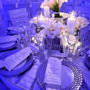 Use of blue lighting within a white wedding. Several different types of floral arrangements were used to accomplish this look: mixed smaller arrangements, tall glass cylinders with sprays of orchids, calla lily and opulent display pieces perched on top of pedestals